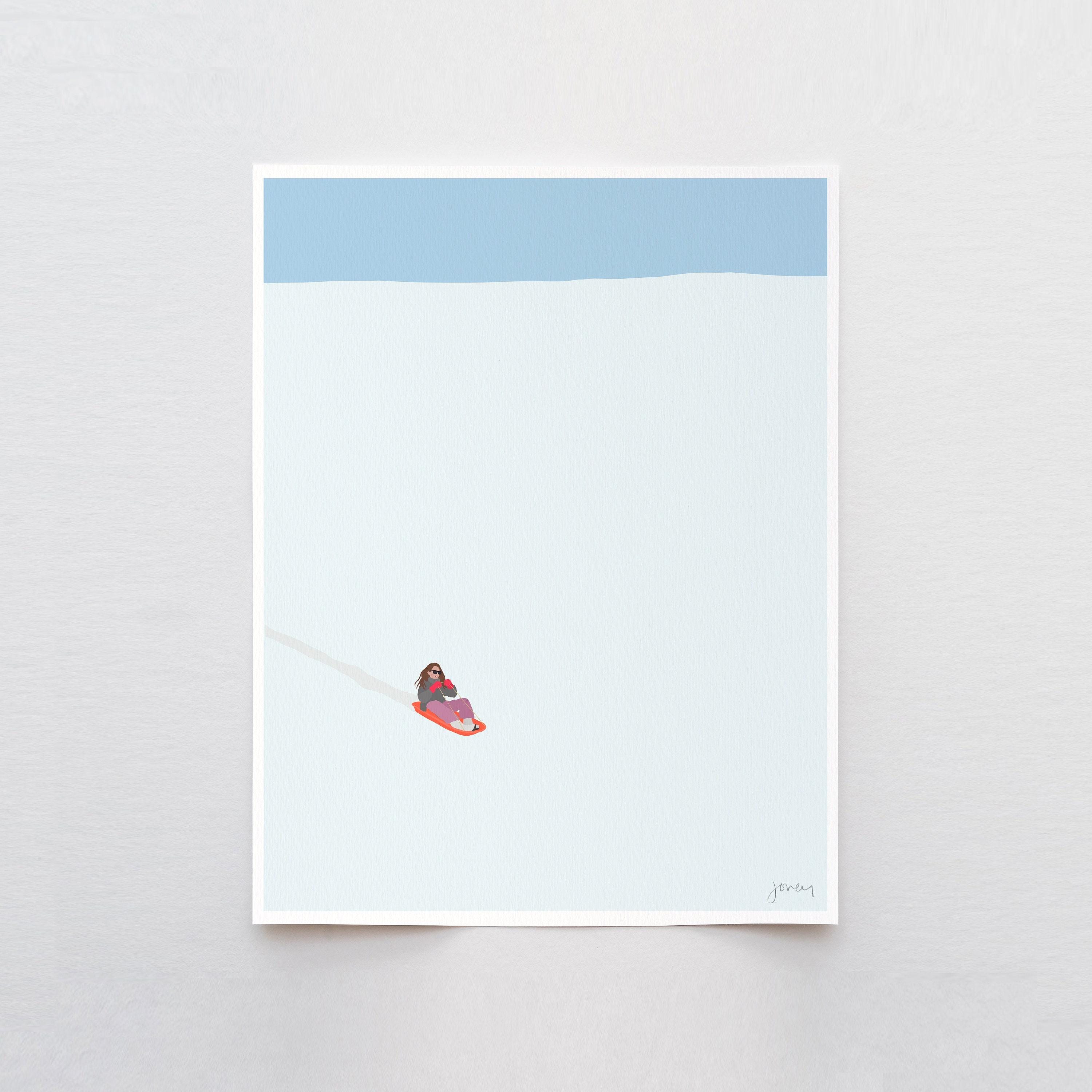 Celebrate the joy and exhilaration of winter with my Girl on Toboggan in the Snow Art Print. Inspired by a family trip to Tahoe, this piece captures the thrill of that first sled ride of the season and the magic of snowy adventures. The minimal composition and soft colors evoke both the energy and calm beauty of wintertime fun.