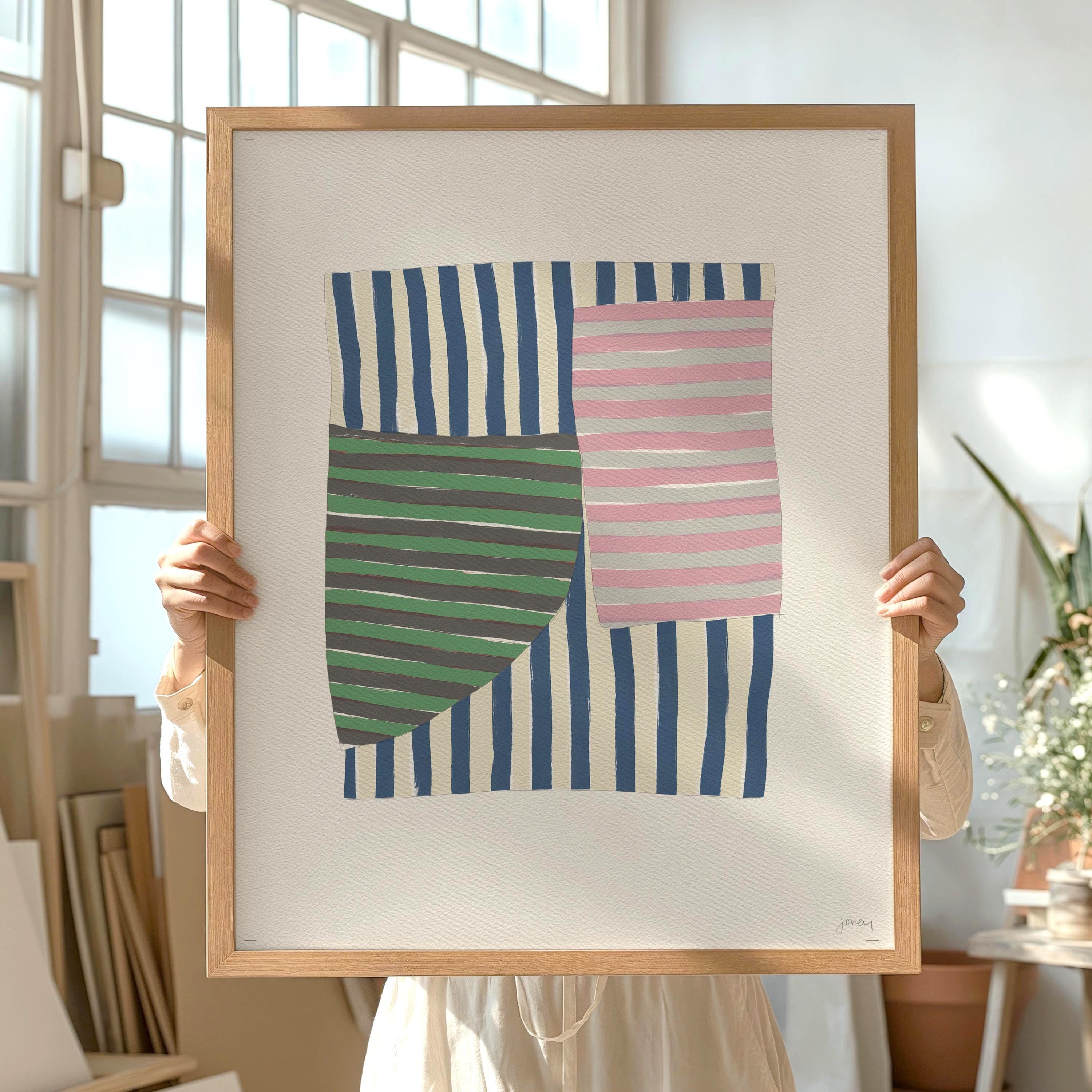 Immerse yourself in the tranquility and balance of this Striped Pink and Green Abstract Art Print. Part of a series of meditative abstracts, this artwork was born during a time when I found comfort in the creation of these pieces, and I hope they bring the same sense of peace to those who experience them.