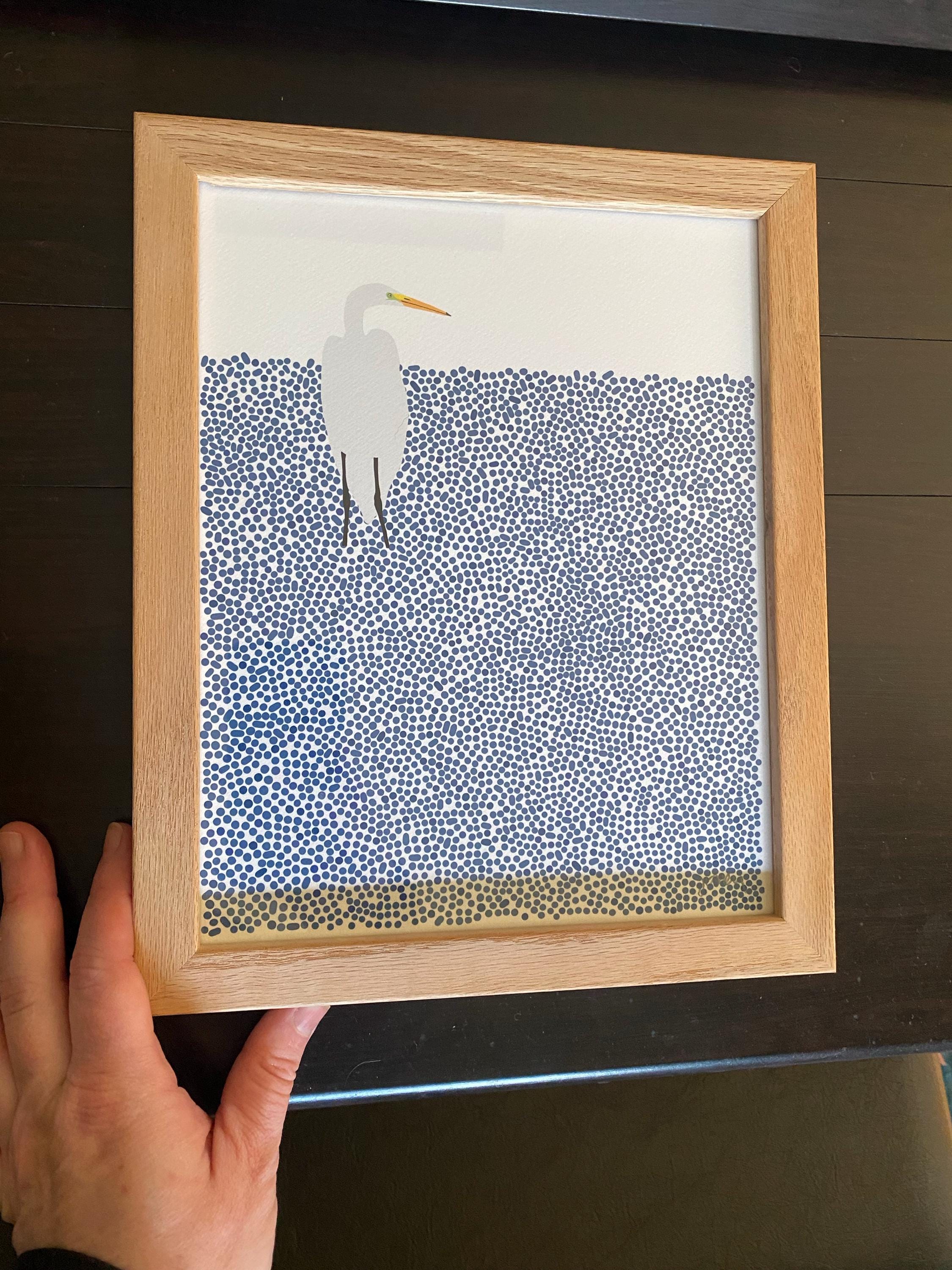 This egret with circles was selected for my bathroom that has blue circular tiles so popular now so it keeps with the theme. We have egrets and herons along our waterfront making this so appropriate. Wish my space would have allowed a bigger version because this print is awesome. Recommend.