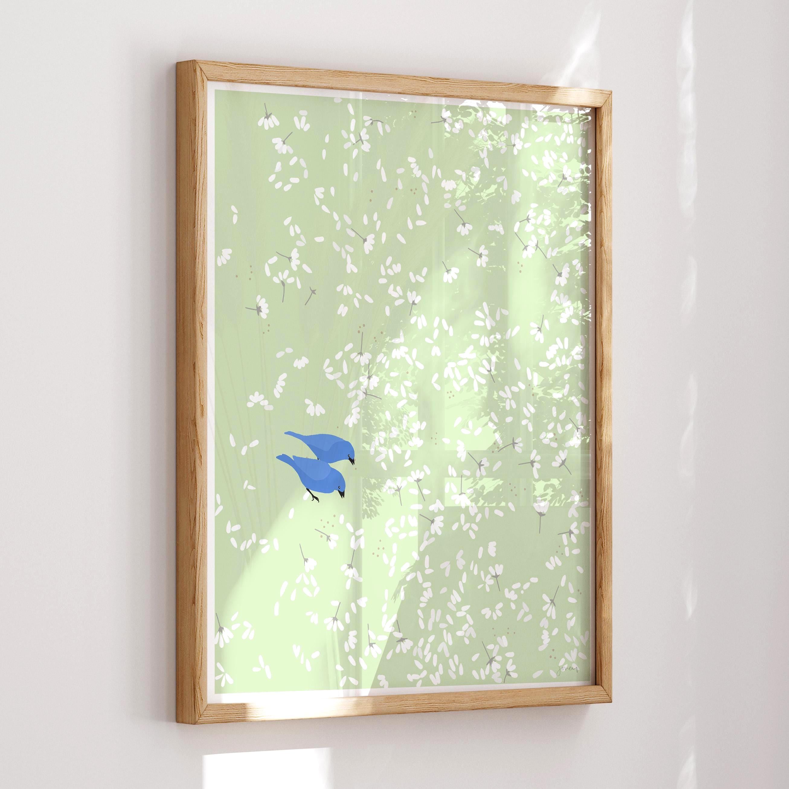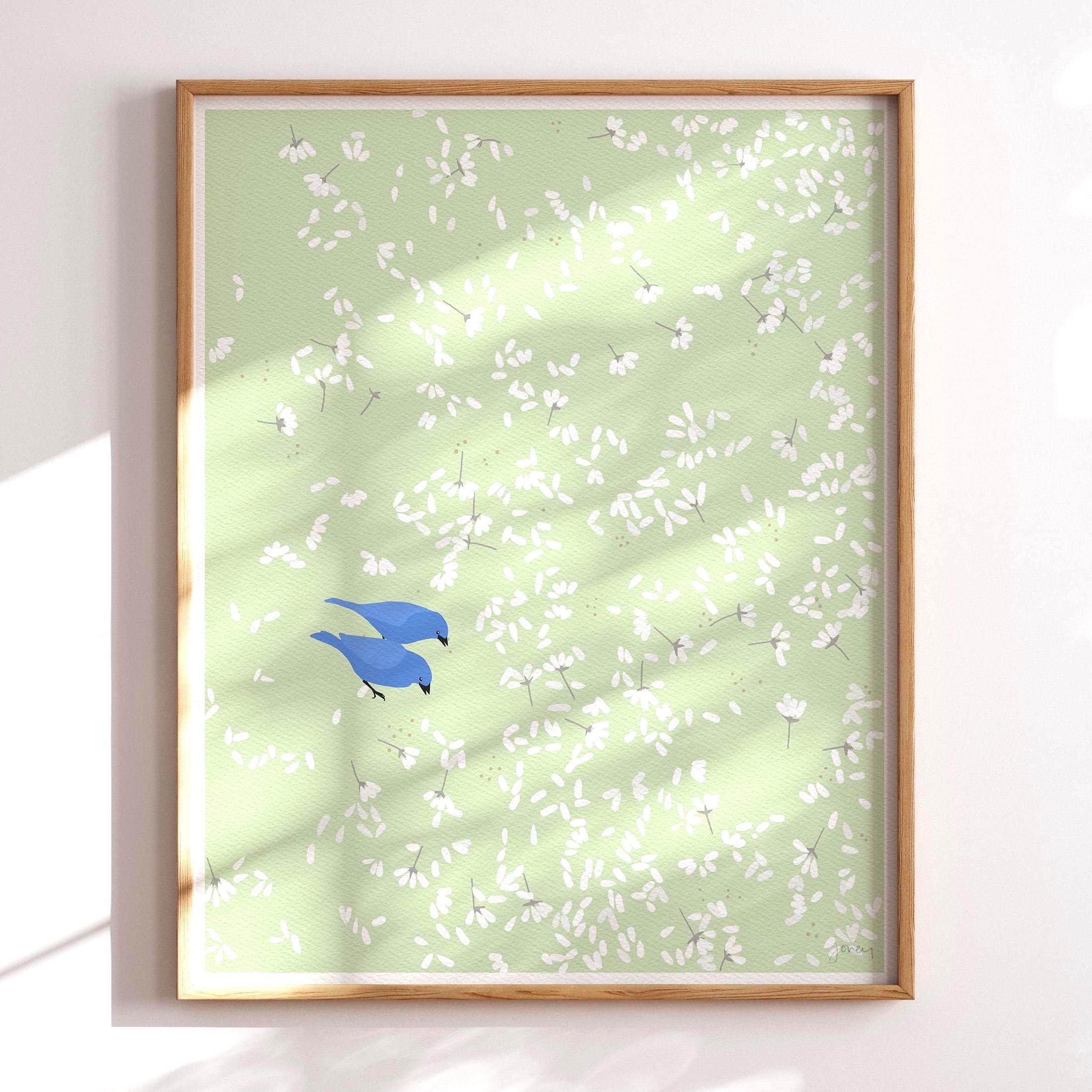 Capture the beauty of everyday moments with my cherry blossoms and "Blue Birds" art print. Perfect for bird enthusiasts and those yearning to infuse their surroundings with the cozy magic of these cheerful birds.