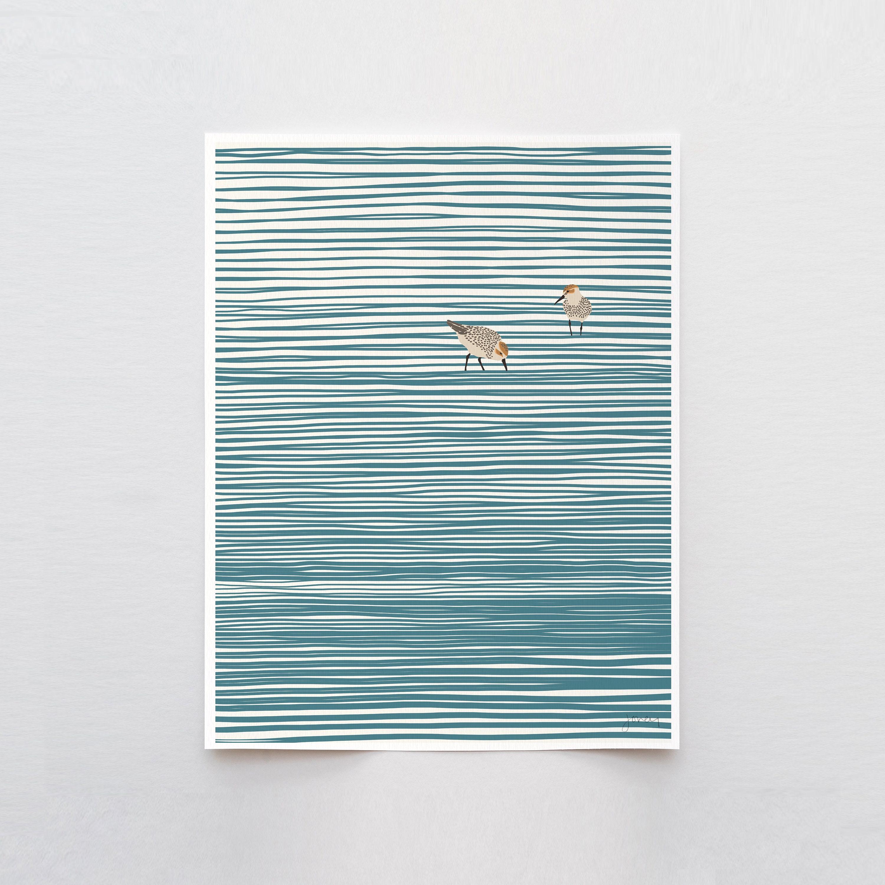 Bring the serene beauty of coastal life into your home with our 'Sandpipers' art print. This delightful piece captures the charm of these coastal birds in a moment of peaceful seaside exploration.